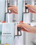 Multi-Function Spray Options: Featuring 3 spray modes - STREAM, SPRAY, and DUAL BROOM, this versatile kitchen faucet adapts to all your needs. Switch effortlessly between powerful cleaning and gentle rinsing for maximum convenience during various kitchen tasks.